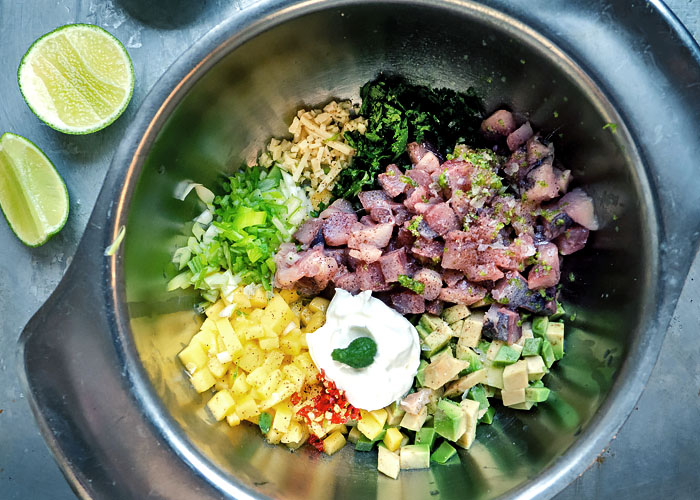 Achtung: Gerade bei Wasabi und Chili müsst ihr euch vorsichtig an die Schärfe rantasten. Fangt behutsam an und legt dann nach persönlichem Geschmack nach. Allein die Limettenwürfel, der Ingwer und die feinen Chiliringe sorgen schon für kleine geschmackliche Explosionen auf eurem Gaumen.
