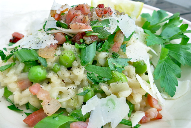 Kurz vor dem Servieren die Hälfte des gebratenen Specks, der Frühlingszwiebel und der Petersilie unterheben. Kurz durchziehen lassen, und nach Geschmack salzen und pfeffern. Der Reis sollte schön schlotzig (neudeutsch für sämig), aber noch nicht zerkocht sein. Wer den Reis weicher haben möchte, lässt ihn einfach mit noch etwas Flüssigkeit weitergaren.