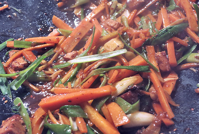 Wer es nicht so ölig möchte, kann jetzt noch etwas überschüssiges Fett aus dem Wok schöpfen. Danach die Möhren und die unteren Teile der Frühlingszwiebel scharf anbraten. Den Knoblauch erst später dazugeben, er soll nicht verbrennen.