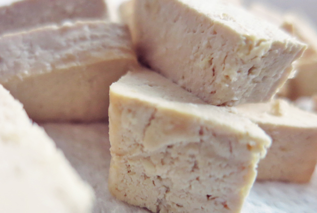 Tofu (Bohnenquark) ist ein Lebensmittel auf Sojabasis. Die Herstellung von Tofu aus Sojamilch ist recht ähnlich der Herstellung von Käse aus Kuhmilch. Mein Tofu stammt aus einem handelsüblichen 250g Paket. Er ist schnittfest und hat dadurch etwas mehr Kalorien, als wässrigere Sorten, die z.B. für Misosuppen verwendet werden.