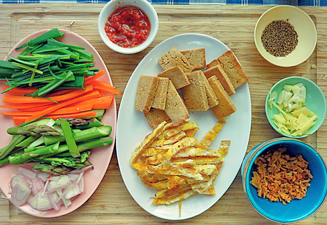 Bami Goreng vegetarisch, alle Zutaten auf Brett
