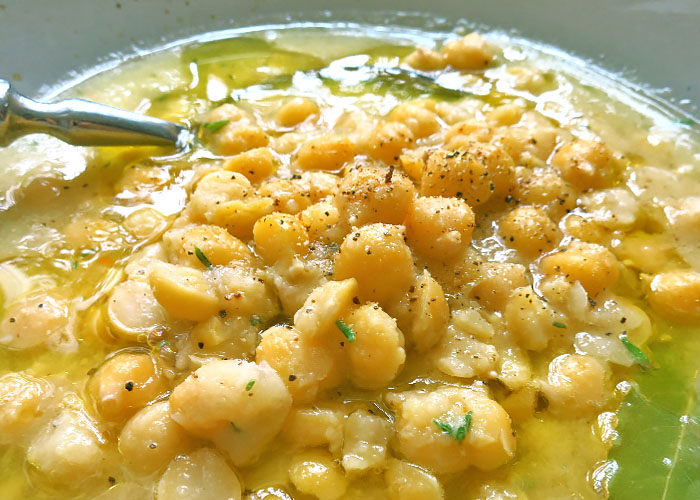 Das Rezept kommt mit weniger als sieben Zutaten aus (Pfeffer, Salz und Natron nicht mitgerechnet). Wer möchte, kann noch andere Gemüse wie Möhre oder Kartoffel hinzufügen. Seit ich die Suppe bei Mark Wiens auf migrationology.com gesehen habe, will ich sie in der puristischen Version nachkochen. Er schwärmt von dem puren Geschmack und der seidigen Textur der Kichererbsen. Gewürzt wird der Eintopf erst zum Schluss mit reichlich frischem Zitronensaft und gutem Olivenöl.