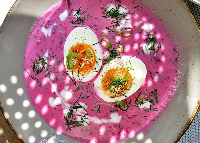 Zum Schluss eines der gekochten Eier mit dem Messer fein hacken und unter die Suppe rühren. Mit Pfeffer und Salz abschmecken. Wer Säure mag, fügt noch einen Spritzer Weißweinessig hinzu. Suppe eventuell mit einem Schuss Wasser, Gemüsebrühe oder Betesud verlängern. Am besten für mindestens eine Stunde kalt stellen und durchziehen lassen.