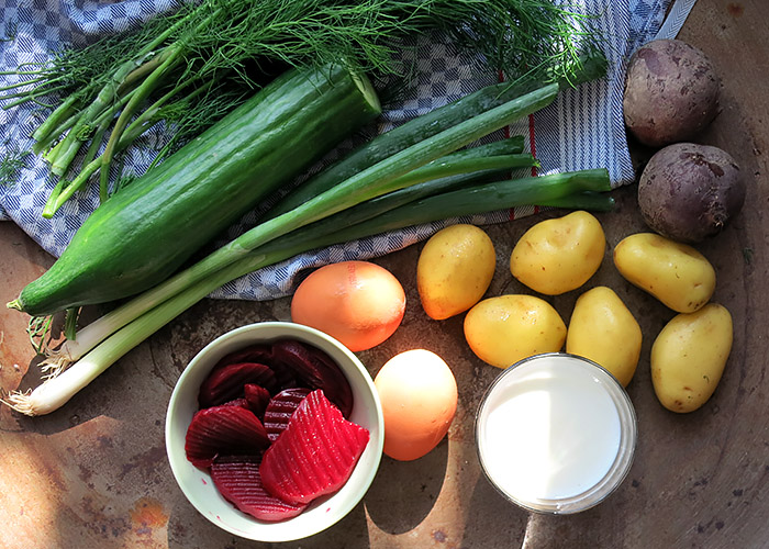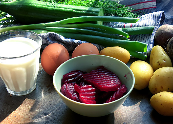 Für die Suppe verwende ich Kefir, auch wenn in anderen Rezepten manchmal Buttermilch oder saure Sahne und Crème fraîche angegeben wird. Kefir, russisch „Кефи́р“ stammt ursprünglich aus dem Kaukasus und ist ein dickflüssiges Sauermilchprodukt. Kefir schmeckt leicht säuerlich und erfrischend. Beim Gärungsprozess bilden sich geringe Mengen von Alkohol und Kohlensäure, weil Hefe zugesetzt wird. Für einen Rausch reicht der Alkohol nicht, sein Anteil im Kefir liegt nur bei 0,1 % – 0,6 %. Bei den normalen Kefir-Produkten aus dem Supermarkt wurde der Alkohol mittlerweile entfernt, nur das ganz leichte Prickeln auf der Zunge ist geblieben. Kefir ist bekömmlich, für Menschen mit empfindlichem Magen ist Kefir eine gute Wahl. Das russische Heilgetränk gilt als gesund, denn seine Milchsäurebakterien regulieren die Darmflora, was für ein funktionierendes Immunsystem wichtig ist.