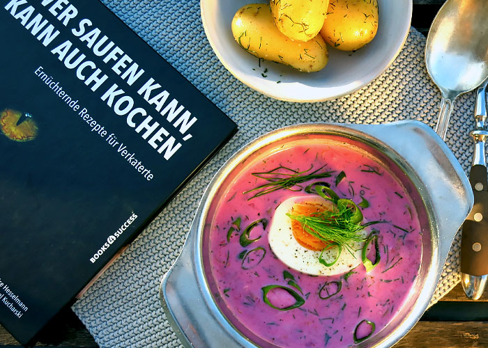 PS: Zu diesem Rezept wurde ich durch das ungewöhnliche Kochbuch „Wer saufen kann, kann auch kochen“ angeregt. Šaltibarščiai kannte ich bisher noch nicht. In dem ungewöhnlichen Buch finden sich ausschließlich Katerkiller-Rezepte. Meine Lieblingszutaten Chili, Ingwer, Koriander und Zitrusfrüchte spielen bei der Rezeptauswahl eine wichtige Rolle. Die Gerichte sind einfach und schnell zubereitet, denn mit einem dicken Kopf will niemand lange in der Küche stehen. Zudem sind sie ein Streifzug durch verschiedene Länderküchen, von Thailand, Vietnam, Litauen bis nach Kolumbien. Getrunken wird schließlich weltweit.