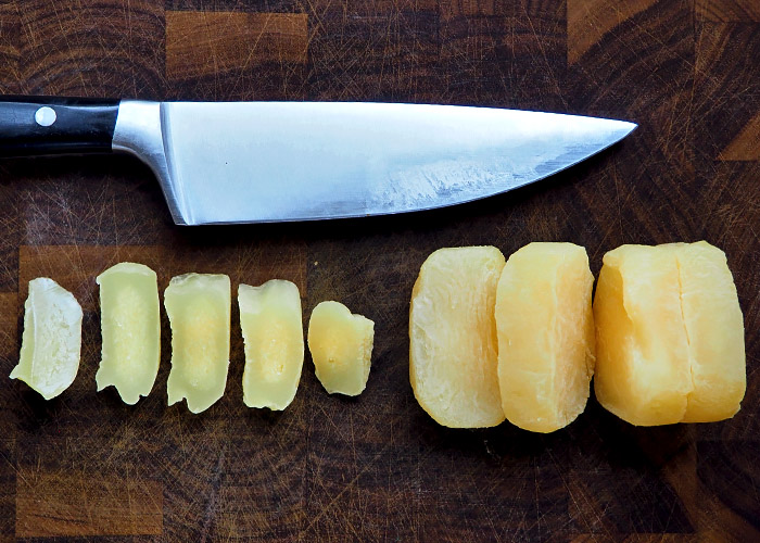 Beim Handkäs gibt es deutliche Abstufungen, was den Reifegrad angeht. Echte Hessen mögen ihn ganz durchgereift, wenn er komplett glasig und fast bernsteinfarben ist. Mir ist er dann zu streng, vor allem der Geruch. Ich mag ihn lieber, wenn er innen noch einen festen Kern hat. Dann schmeckt und riecht er deutlich milder.