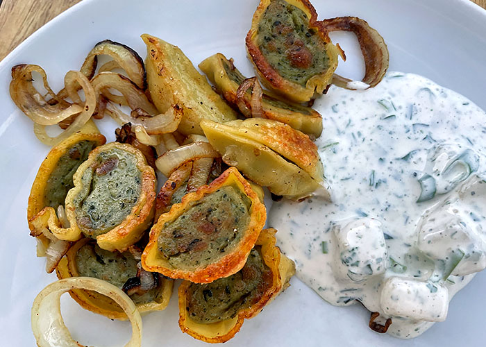 Wem das alles zu streng ist oder wer die schlimme Zwiebelfahne fürchtet, für den habe ich noch ein milderes Einsteiger-Rezept. Hier wird der Handkäs‘ in Schmand, saurer Sahne und frischen Gartenkräutern eingelegt. Schon nach kurzer Zeit nimmt der Schmand den würzigen Geschmack des Handkäses an. Der Zwiebelgeruch entfällt jedoch.