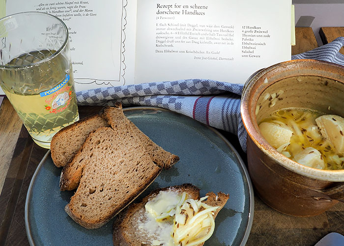 Das Rezept für den „scheene dorschene Handkäs“ habe ich in dem alten Darmstädter Kochbuch „Supp’, Gemüs’ unn Fleisch“ gefunden. Korrekt auf Hochdeutsch übersetzt bedeutet das: Rezept für einen richtig gut durchgezogenen Handkäse. Für den „Dorschenen“ werden die Käsetaler mit viel Zwiebeln und Kümmel in Essig, Öl und Ebbelwoi eingelegt und müssen dann durchziehen. Der Handkäs eignet sich für die Bordküche, weil er nur kühl gelagert wird und nicht in den Kühlschrank muss. Die strenge Zwiebelfahne, die man beim Verzehr unweigerlich bekommt, weht der Wind zum Glück schnell wieder über Bord.