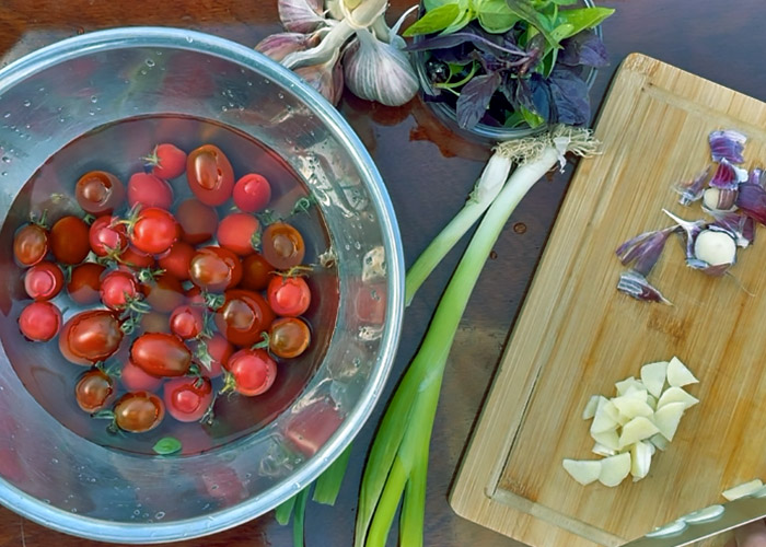 Bordküche: Tomaten & Basilikum vom Balkon, frischer Knoblauch aus Tunø