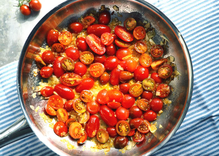 Pasta Version eins: geschmorte Cherrytomaten mit Butter & Basilikum