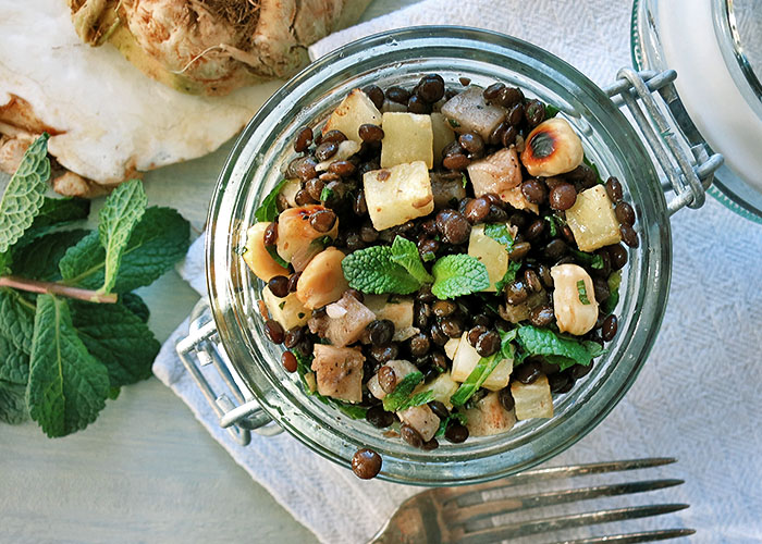 Schwarzer Linsensalat mit Sellerie und Haselnüssen