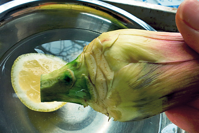 Artischocken putzen: Stiel pikieren und Zitronenwasser