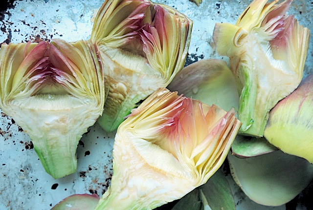Frische Artischocken geputzt und halbiert