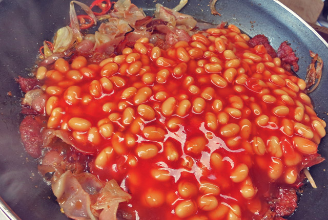 Baked Beans mit Speck in Pfanne