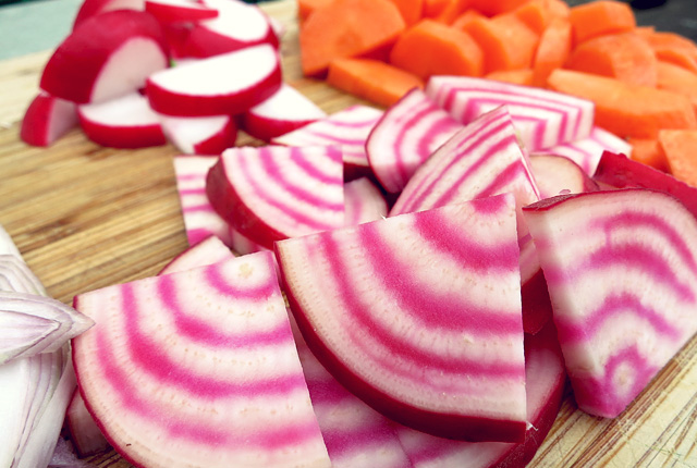 Wurzelgemüse: Bete und Moehrenauf Brett