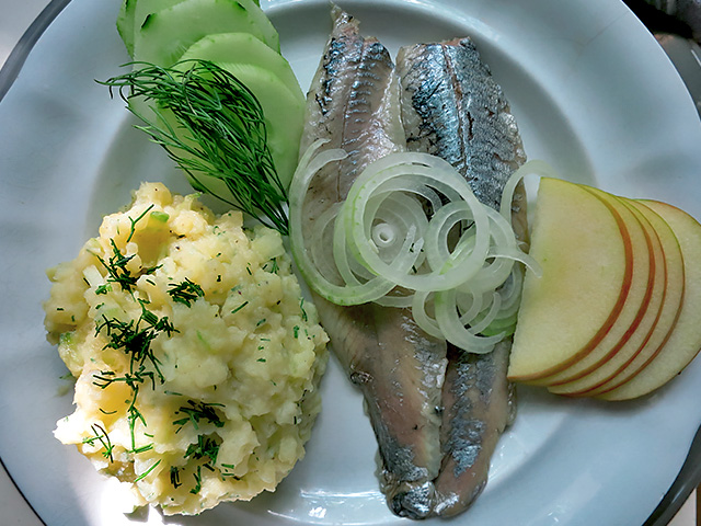 Neue Matjesfiltets mit Stampf und Zwiebeln