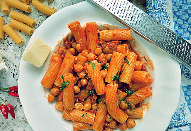 Kichererbsen Pasta mit Chorizo Käse am Stück von oben