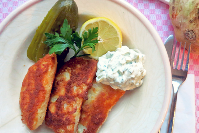 Sellerieschnitzel auf Karotuch und Teller