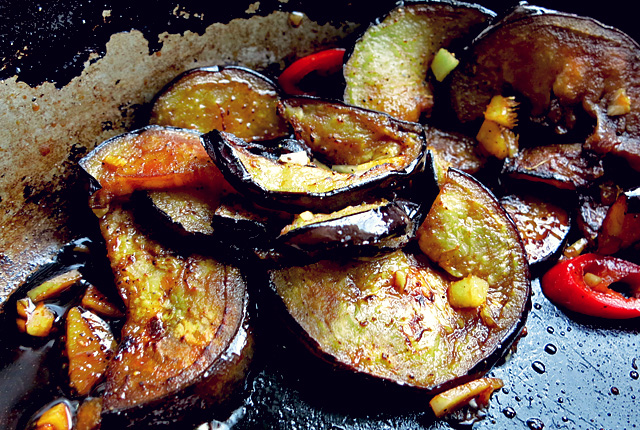 Auberginen gebraten, mit ingwer, Chili, Knoblauch und Sojasauce