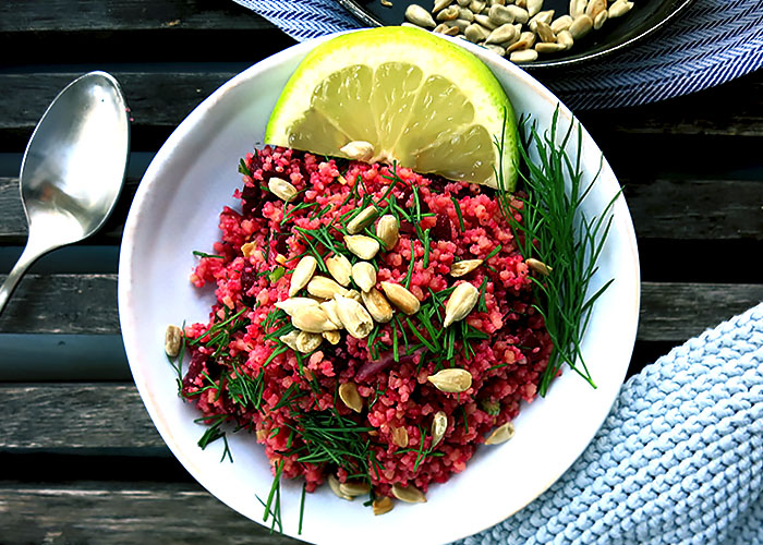 Der schnelle „pinke“ Couscous Salat mit Rote Bete ist eine Art Beifang des vorherigen „Šaltibarščiai“ – kalte Rote-Bete-Suppe Rezepts. Die Zutaten frische Rote Bete und Dill hatte ich übrig, den praktischen Couscous bunkere ich ohnehin immer. Gute Nachrichten für Rote Bete Fans: Ab Oktober beginnt die Saison des intensiven und gesunden Wintergemüses. Der leckere, pinkfarbene … Weiterlesen Pink Couscous Salat – Rezept mit Rote Bete und Dill