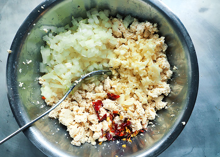 Tofu, Zwiebel, Ingwer, Chili und Schüssel